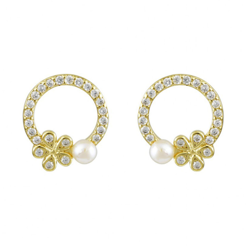 Σκουλαρίκια με κύκλο και λουλούδι από ασήμι 925° με λευκό ζιργκόν και μαργαριτάρι